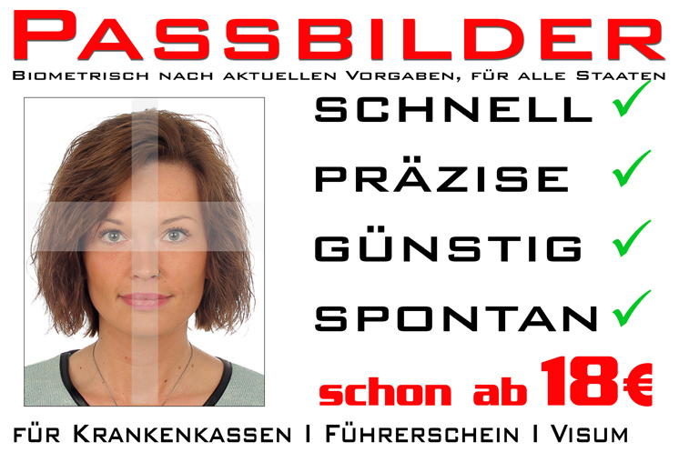 Nichts ist so schlimm, wie, endlich einen Termin beim Passamt zu ergattern und kurz vor dem Termin Passbilder zu machen, die am Ende von den Behörden abgelehnt werden. Genau aus diesem Grund arbeiten wir präzise nach den Vorgaben der Bundesdruckerei und übernehmen die volle Garantie, dass unsere biometrischen Passbilder auf jeden Fall angenommen wird. Außerdem benötigen Sie KEINEN TERMIN für Passfotos (auch Größen für fast alle Länder). Alle Passbilder sind innerhalb 5-10 Minuten fertig zum Mitnehmen.